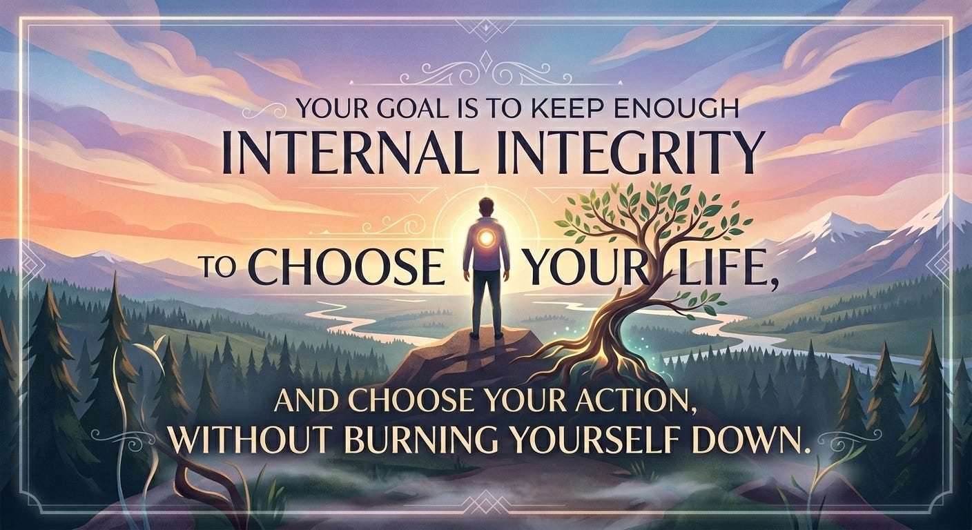 Your goal is: keep enough internal integrity to choose your life, and choose your action, without burning yourself down.